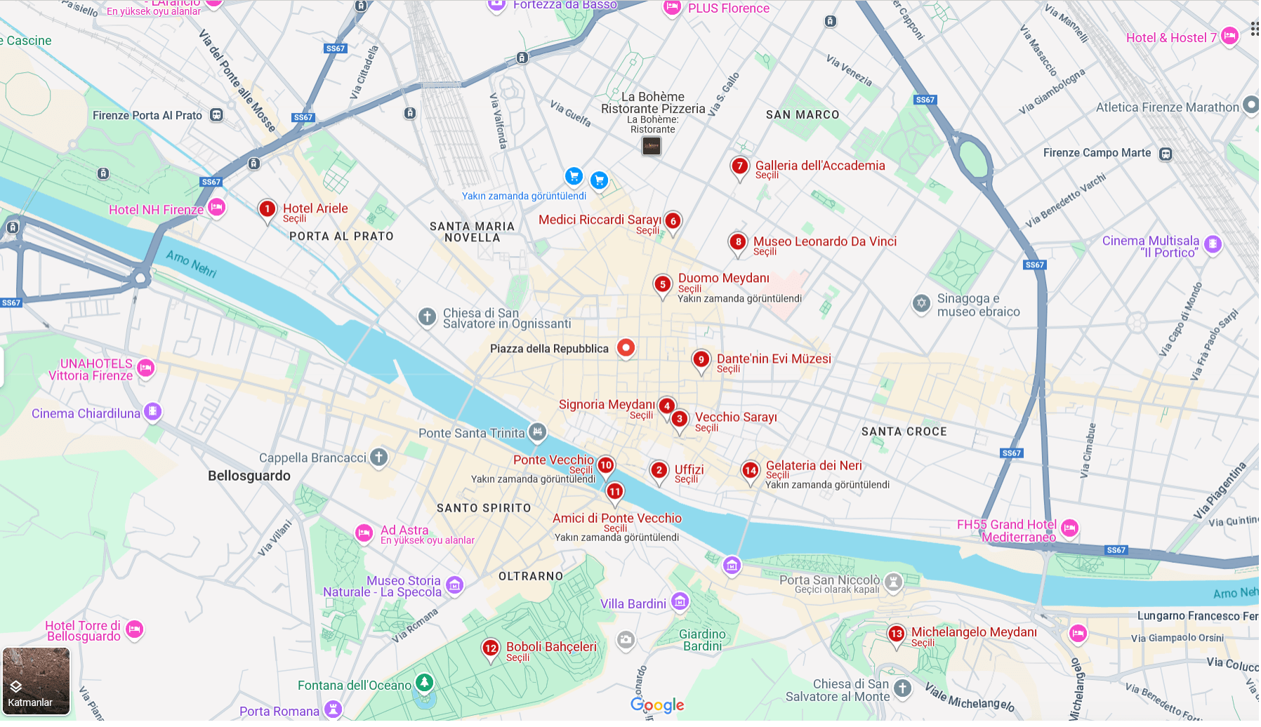Haritada işaretlediğim gibi, Uffizi Müzesi’nden sonra şehrin tarihi merkezindeki turistik noktalar birbirine oldukça yakın konumda yer alıyor. Aslında detaylı bir plan yapmadan bile kısa bir yürüyüşe çıktığınızda pek çoğu kendiliğinden karşınıza çıkıyor. Biz ilk kez gelmenin heyecanıyla, önceden hazırladığımız plan doğrultusunda Uffizi Müzesi’nden yukarıya doğru ilerleyerek haritada işaretlediğimiz yerleri sırasıyla gezmeye başladık.
