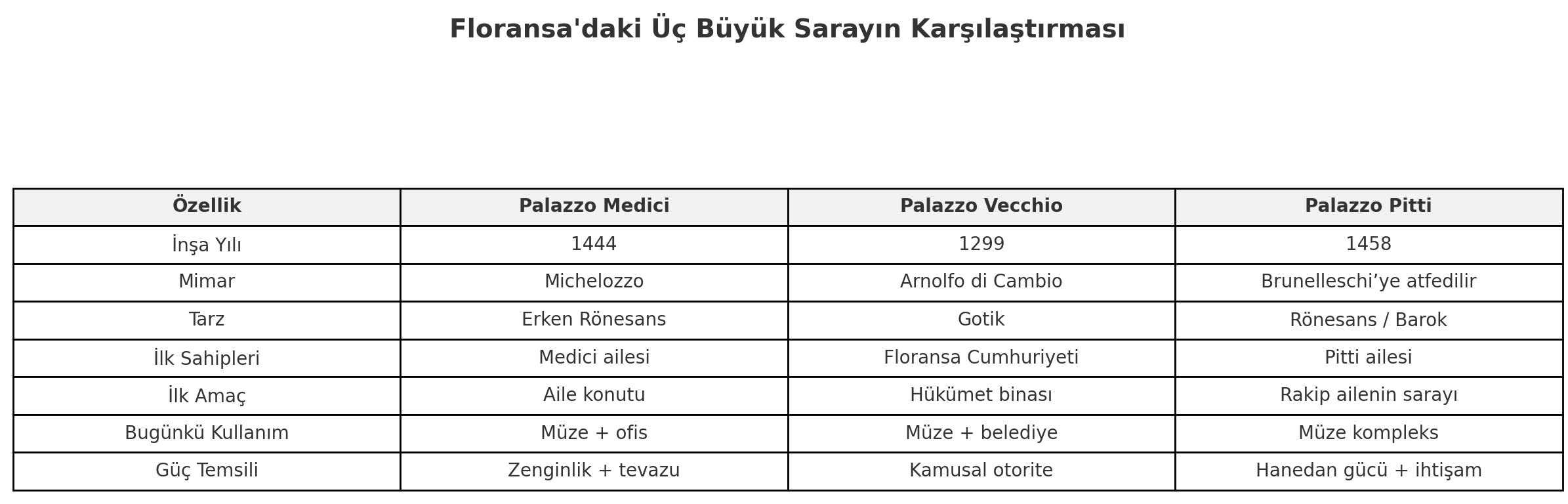 Medici Sarayı’na kadar gelmişken hemen yanı başında yer alan ve Medici Bankası’nın kurucusu Giovanni di Bicci de’ Medici’nin mezarının da bulunduğu San Lorenzo Bazilikası da ziyaret edilebilir. Bu arada Floransa’da birden fazla saray olup (Palazzo Medici Ricardi, Palazzo Vecchio, Palazzo Pitti) Floransa tarihine özel bir merakınız yoksa birini gezdikten sonra diğerlerini gezmek istemeyebilirsiniz. Bu nedenle, aşağıda bu üç sarayı karşılaştıran kısa bir özet tabloya yer veriyorum.