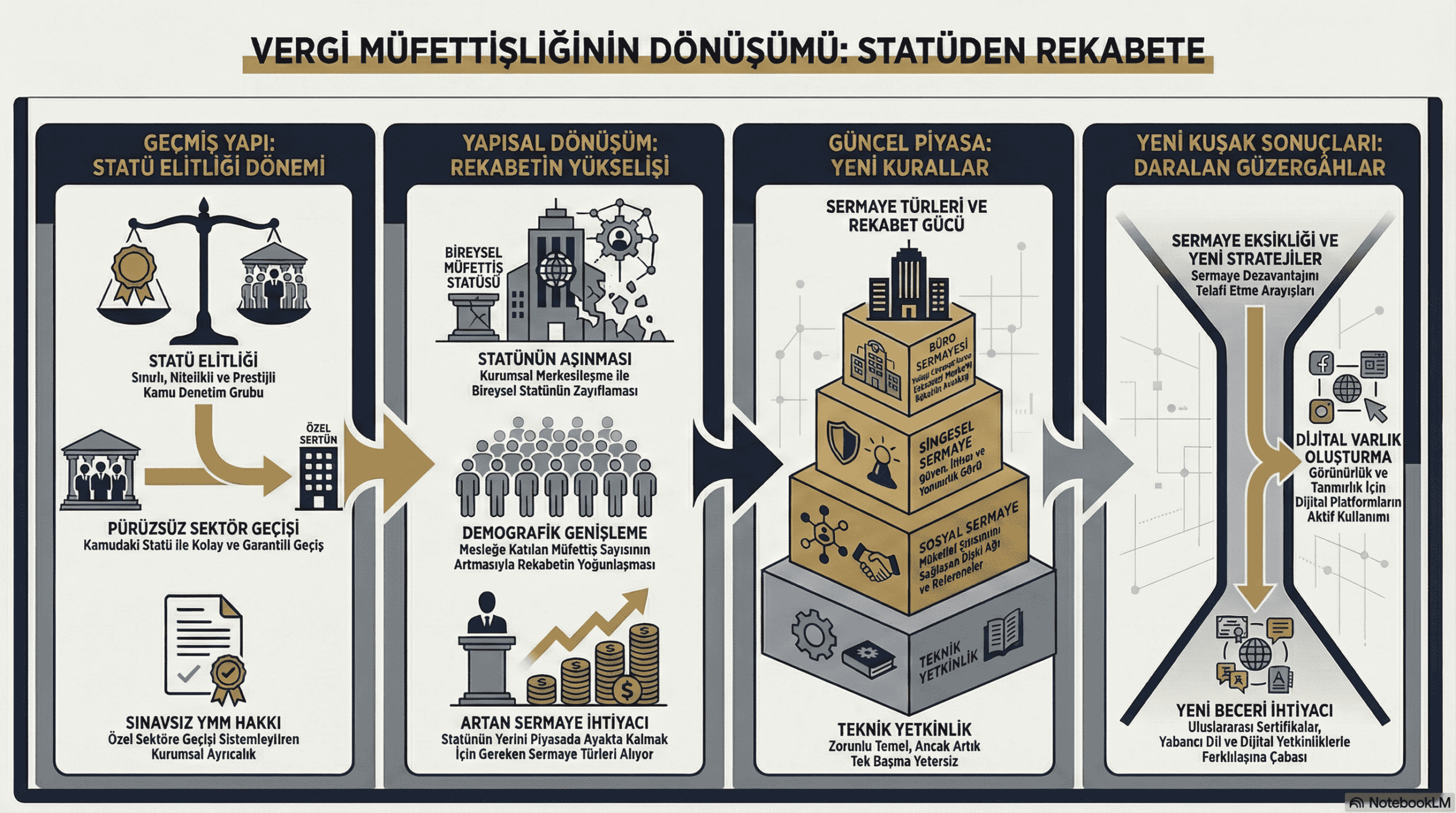 Özetle, geçmişte özel sektöre Yeminli Mali Müşavir olarak geçen müfettişlerin, dönemin koşulları itibarıyla ilave beceriler kazanmalarına gerek kalmaksızın yüksek kazanımlar elde edebilmeleri mümkünken; günümüzde hizmet verilen mükellef portföyünün eşitsiz biçimde dağılması nedeniyle, ruhsat dışında resmî ve düzenlenmiş bir beceriye sahip olmayan, sosyal ve simgesel sermaye açısından dezavantajlı bir başlangıç noktasında bulunan yeni kuşak YMM’ler açısından şartlar gittikçe zorlu hale gelmektedir. Tabii diğer taraftan, en az on yıllık tecrübeye sahip, Yeminli Mali Müşavirlik sınavlarını vermiş bir müfettişin; odacı, yoklamacı veya veri girişi yapan personelle özlük hakları ve mesleki itibar bakımından aynı kefeye konduğu günümüz koşullarında, yukarıda bahsedilen zorlukların hiçbir öneminin kalmadığı da açıktır.